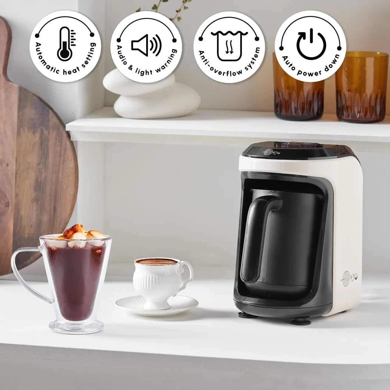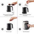 De Hatır Hüps Turkse koffiemaker met melk is ’s werelds eerste apparaat dat zowel gebrande Turkse koffie als andere heerlijke warme dranken met melk kan bereiden. De koffiemaker, die Turkse latte, warme chocolademelk en instantkoffie met melk tot de ideale consistentie bereidt, verwarmt koffie en andere dranken tot de juiste temperatuur zonder aanbranden dankzij automatische temperatuurregeling. Daarnaast voorkomt de slimme sensor van het apparaat overkoken en morsen.