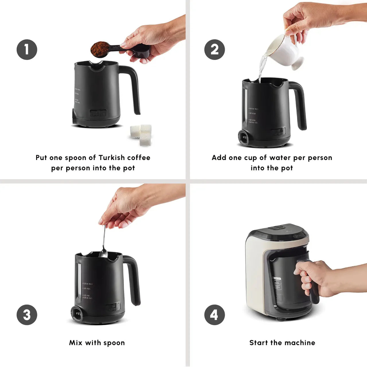 Doe één kopje water, één maatschep Turkse koffie en suiker naar persoonlijke smaak in de Hatır Hüps kookpot en druk op de knop “Gebrande Turkse koffie bereiden”. Wanneer het signaal klinkt dat de koffie klaar is, kunt u deze inschenken. U kunt tot vijf kopjes tegelijk bereiden.