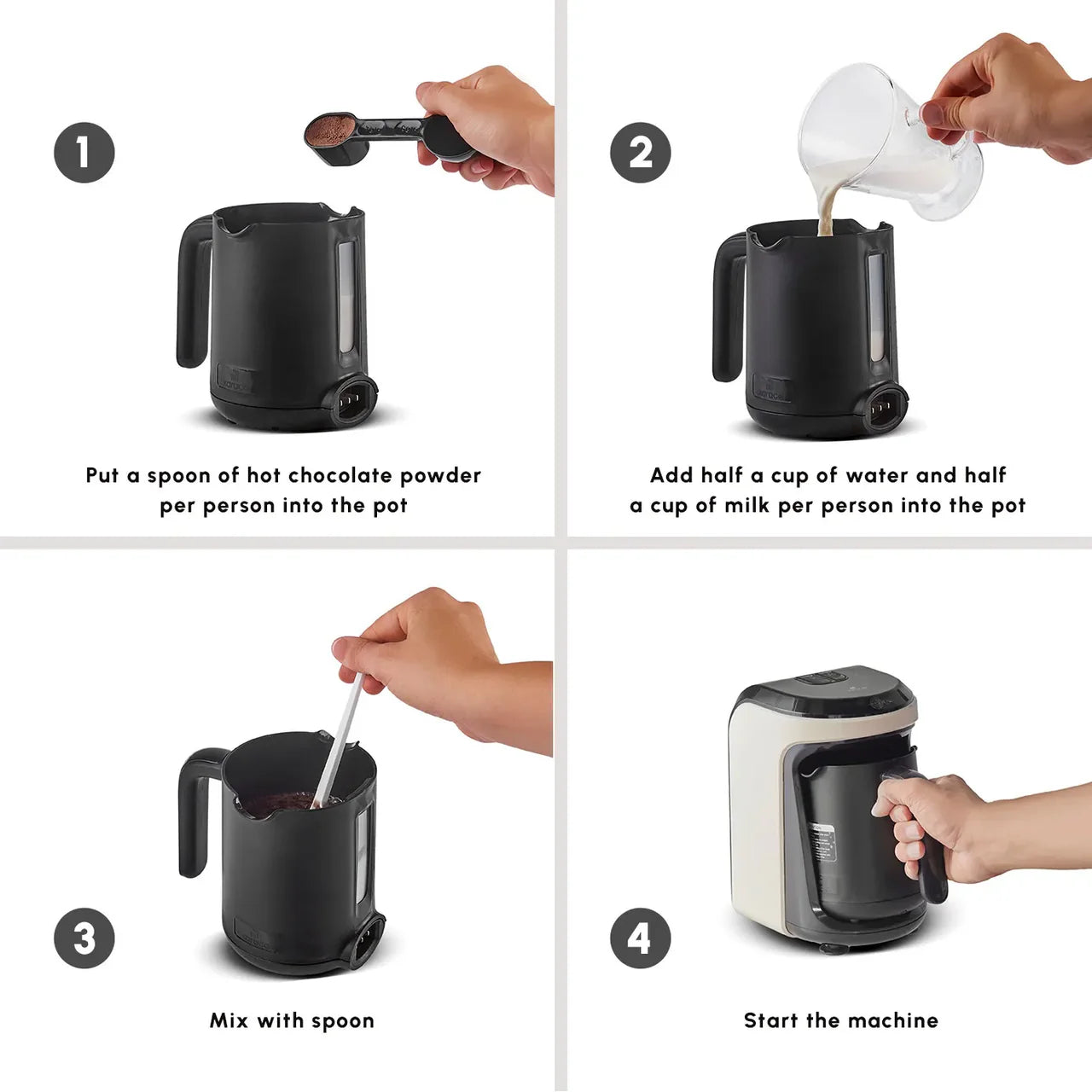 Doe een glas melk en één maatschep chocolademelkpoeder in de kookpot. Plaats de pot in het apparaat en druk op “Dranken met melk bereiden”. Wanneer het signaal klinkt, is de drank klaar om te serveren.