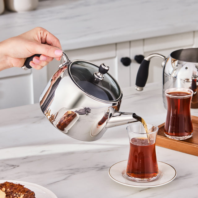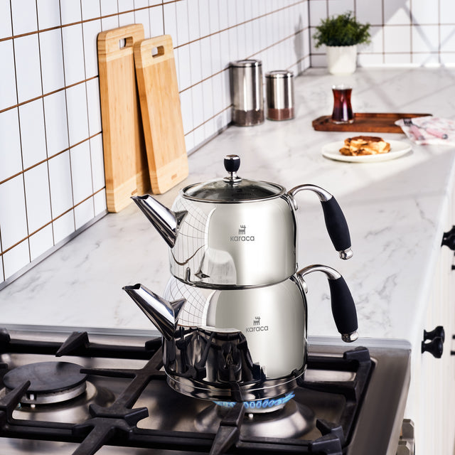 Dankzij de 18/10 Cr-Ni roestvrijstalen structuur is de Karaca stalen theeset uiterst duurzaam, biedt het een gezonde gebruikservaring en zorgt het voor heerlijk gezette thee. De set bestaat uit een 1-liter theepot en een 2-liter waterkoker. Met de hittebestendige handvatten kunt u de thee eenvoudig inschenken.